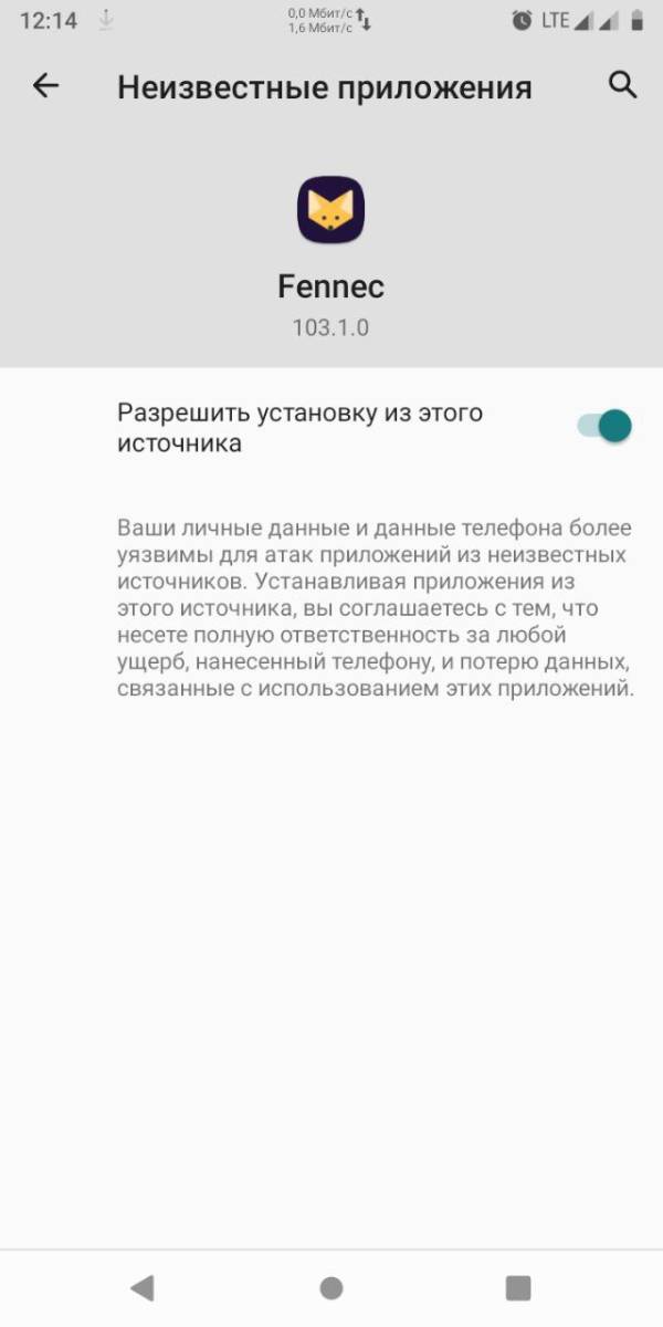 1. Убедитесь, что у вас включена функция «Установка неизвестных источников». Для этого просто перейдите в «Настройки» > «Приложения и уведомления» > «Все приложения», затем выберите текущий браузер, который вы используете. Зайдите в пункт «Неизвестные приложения» и включите параметр «Разрешить установку из этого источника». В моем случае это Fennec, и у меня уже включен этот параметр.