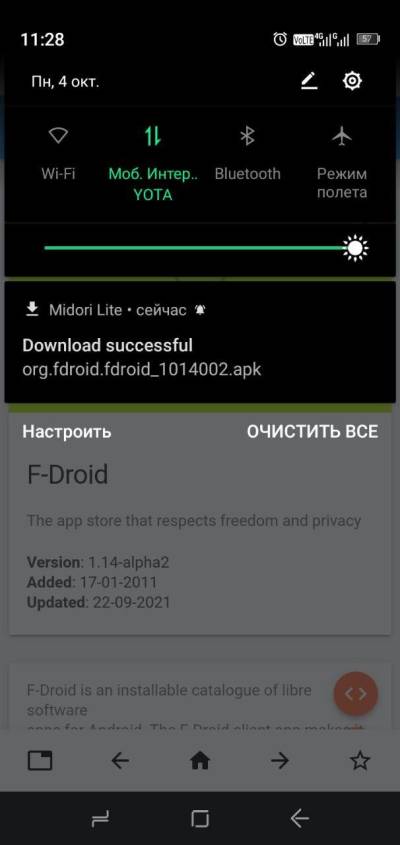 Чтобы загрузить приложение со страницы Fossdroid, нажмите на оранжевую иконку со стрелкой вниз в правом нижнем углу экрана или нажмите на три вертикальные точки в правом верхнем углу страницы и выберите Download. В этом случае начнется загрузка APK-файла. После завершения загрузки нажмите на уведомление о завершении загрузки Android, чтобы начать установку приложения. Появится окно с описанием разрешений, необходимых для работы приложения, и предложением установить или отменить. Нажмите на кнопку Установить, чтобы установить приложение. После завершения установки нажмите на значок приложения в списке установленных приложений, чтобы запустить его.