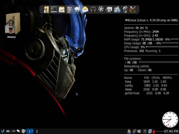 4MLinux - один из таких дистрибутивов Linux, который требует меньше системных ресурсов и может даже работать даже на 128 МБ ОЗУ. Настольная версия выпускается только для 32-битной архитектуры, а серверная версия - 64-разрядная.