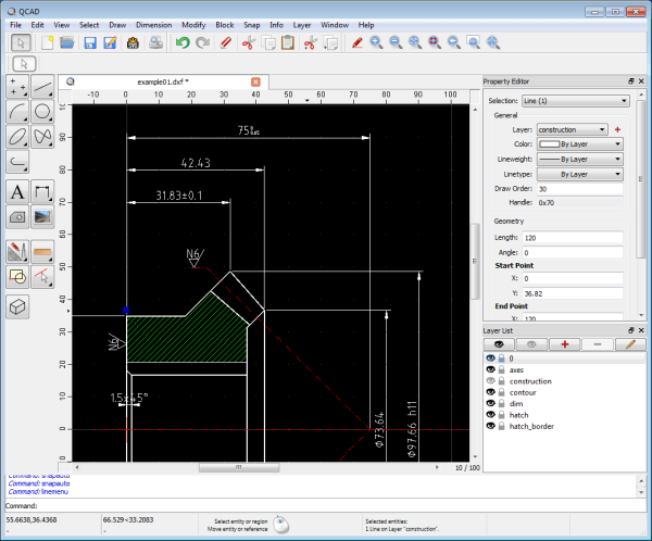 Возможности QCAD включают слои, группы блоков, привязки объектов, инструменты измерения, печать в масштабе, поддержку шрифтов TrueType, 40+ инструментов построения, 35 шрифтов CAD, 20+ инструментов модификации и многое другое.