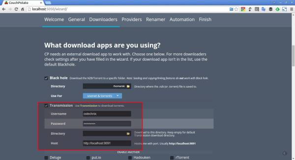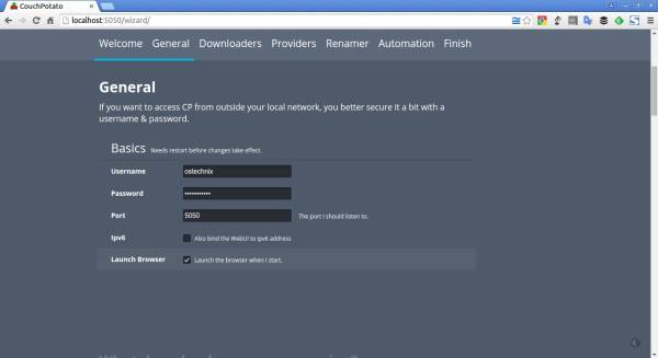 На панели инструментов CouchPotato немного прокрутите список и заполните строки в разделе General. Если вы хотите получить доступ к CP (CouchPotato) из-за пределов локальной сети, вам лучше защитить его с помощью имени пользователя и пароля.