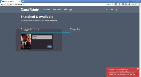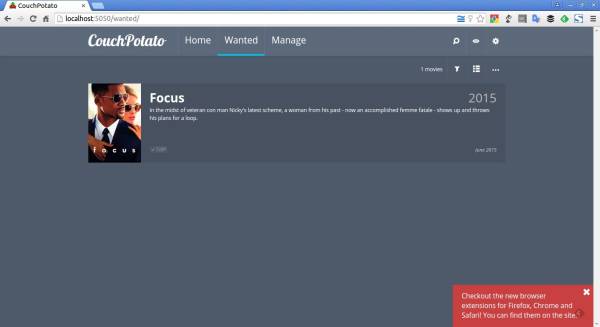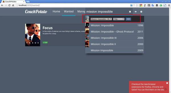 Кроме того, разработчик CouchPotato разработал расширения для браузеров Mozilla Firefox, Google Chrome и Safari, чтобы легко добавлять фильмы через IMDB.com.