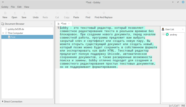 Gobby - это текстовый редактор, который предоставляет возможность совместного редактирования текста в реальном времени без блокировок. При создании нового документа, перед началом совместной работы, программа предложит вам выбрать закрытый ключ и сертификат или создать новую пару. Вы можете открыть существующий документ или создать новый, который позже можно будет сохранить в собственном формате или экспортировать как файл HTML. Текстовый редактор предлагает полную поддержку Unicode, автоматическое сохранение документов, а также расширенные возможности поиска и замены. Gobby отлично подходит для создания и совместного редактирования простых текстовых документов, он не поддерживает форматирование.