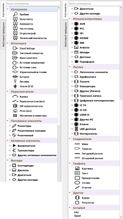 В разделе «Компоненты» расположены все доступные компоненты для моделирования. Вам просто нужно перетащить каждый компонент и соединить их вместе проводами, которые автоматически располагаются, когда вы рисуете линию с помощью мыши. Компоненты сгруппированы вместе, например, источники, переключатели, пассивные элементы, активные компоненты и т.д.