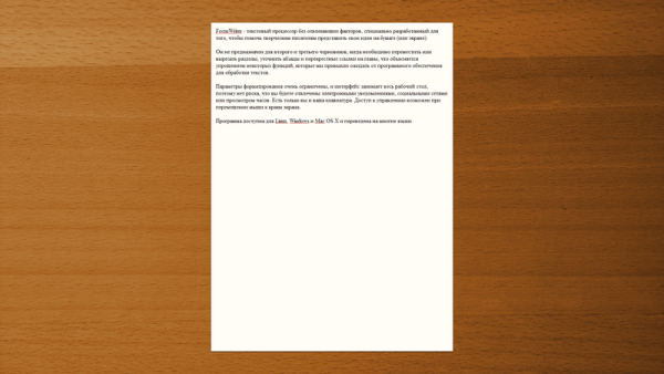 FocusWriter - текстовый процессор без отвлекающих факторов, специально разработанный для того, чтобы помочь творческим писателям представить свои идеи на бумаге (или экране).