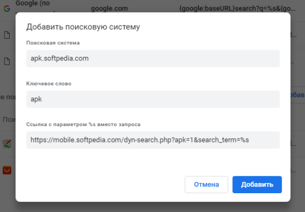 Поле Поисковая система на самом деле является URL-адрес сайта, который вы хотите найти. В нашем случае это apk.softpedia.com, который указывает непосредственно на раздел APK, в котором мы осуществляем поиск файлов.