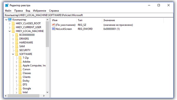 Если первый способ не сработал, то попробуйте отключить экран приветствия через редактор реестра. Ещё раз откройте его при помощи команды «Выполнить», как это было показано в первом способе, и введите regedit в появившимся окошке. В левом меню перейдите к HKEY_LOCAL_MACHINE → SOFTWARE → Policies → Microsoft → Windows. В правом — переведите курсор на пустое поле и нажмите на правую кнопку мыши. Выберите пункт «Создать параметр DWORD 32». Переименуйте параметр в NoLockScreen. Щёлкните по нему два раза и в значении укажите единицу. Нажмите на ОК.